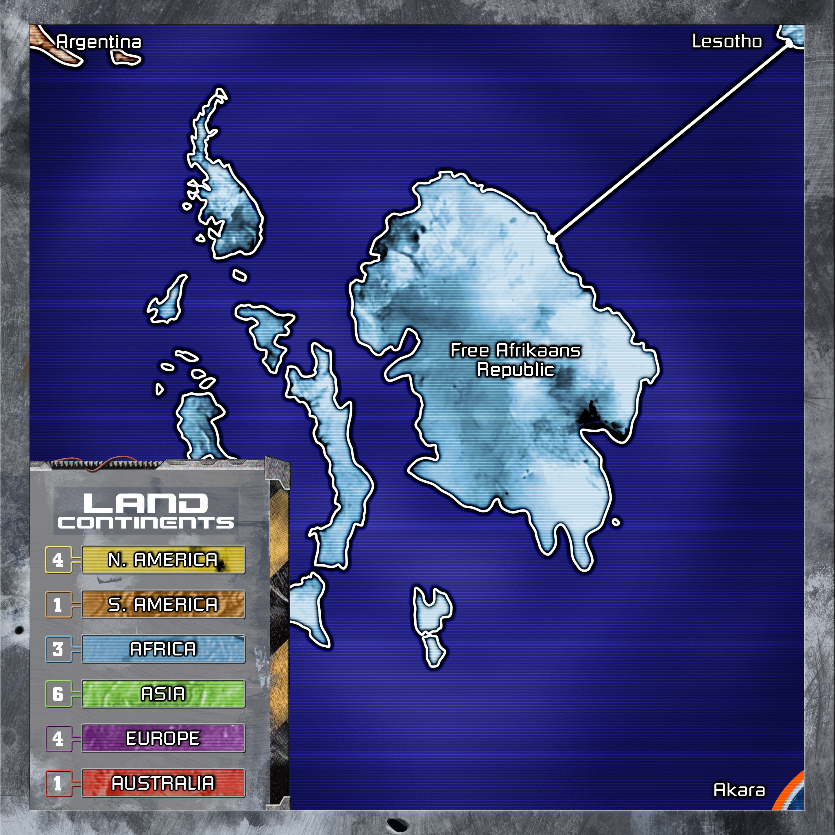 The game begins with both the additions of the Antarctica map and with two continent gaining increased continental bonuses i.e. South America (3) and Africa (4). As suggested above there are additional territory connections from Argentina (South America) to Shackleton (Antarctica), Lesotho (Africa) to Free Africaans Republic (Antarctica) and Akara (Indian Ocean) to Independent Kansas (Antarctica). Four addition land territory cards representing the new Antarctica territories are also added to the existing land deck and are set-up normally during the initial phase of the game. One additional Global Warming is also added into deck of diplomat cards at the beginning of the game.